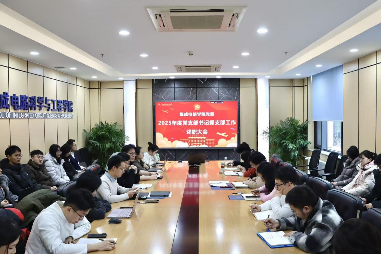 1月19日下午,集成电路科学与工程学院2025年度党支部书记抓支部工作述职大会于第一馆113召开。学院党委书记高静、党委委员彭守仲、专职组织员崔奕凡、专职辅导员丁瑞云、邓修齐、各师生党支部书记参加会议,会议由党委书记高静主持。会上,各党支部书记围绕学习贯彻党的二十届四中全会精神和全国教育大会精神,聚焦党建引领与业务融合,重点汇报了学习教育开展情况、支部建设重点任务落实情况及特色品牌活动开展情况。从左到右...