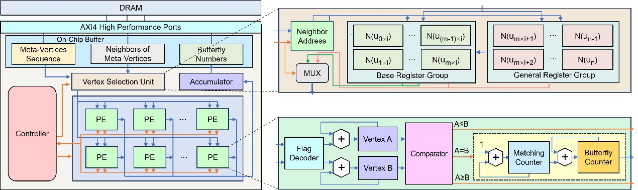 蝶形计数(Butterfly Counting)问题旨在统计图结构中蝶形的数量,是图计算领域的基础问题。现有的蝶形计数算法需重复遍历图中的大量顶点,且由于大规模图数据的可复用性极低,蝶形计数算法存在着显著的高延迟与高能耗问题。为解决以上问题,本研究提出了一种软硬件协同优化的蝶形计数方法。其核心创新在于:一种可支持高度并行与流水线处理的轻量级算法;可提升稀疏数据处理效率的数据压缩与剪枝策略;将软件算法上的优化与FPGA硬件架构无缝集成,大幅提升了整体计算效率。实验结果表明,与基于CPU(512 GB DRAM)和 CPU+GPU(128 GB DRAM)的方法相比,在仅使用 4 GB DRAM的情况下,分别实现了15.84倍和1.35倍的性能提升;同时,其能效达到了CPU+GPU方案的50.14倍,为高能效社区分析与推荐系统提供了可行优化方案。