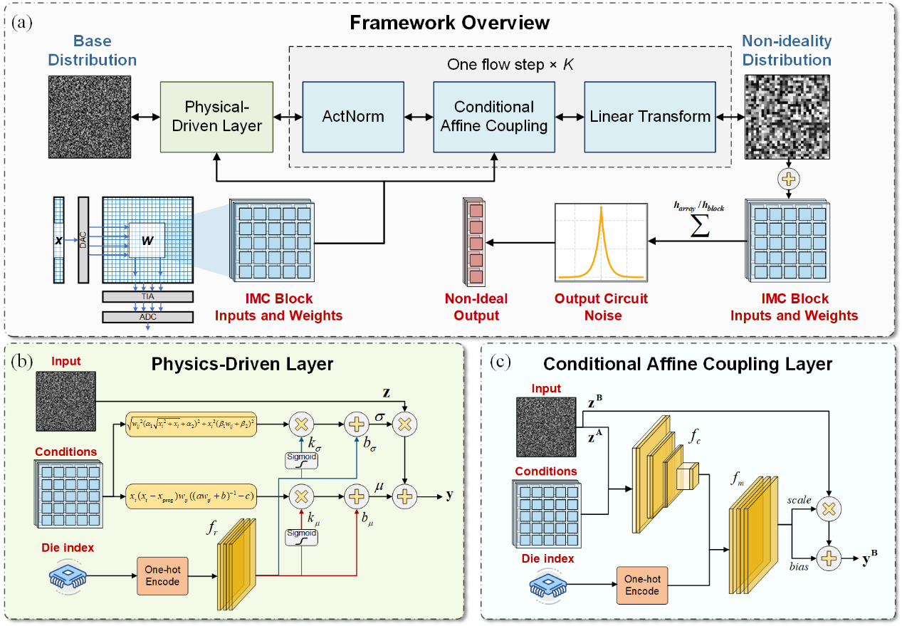 存内计算IMC芯片广受器件非线性、线阻、编程误差和噪声等非理想效应影响,严重制约精度和应用落地。本文提出PDGM-IMC,首个物理与数据协同驱动的生成式建模框架。方法基于归一化流模型,在生成器中嵌入物理驱动层,显式模拟器件与电路非理想性,同时结合条件仿射耦合层对实测数据进行学习,捕捉空间相关性和芯片间差异。该框架不仅具备可解释性,还能显式估计概率密度,支持后续误差补偿优化。在40nm eFlash IMC SoC上测试表明,建模精度相较现有方法提升最高4.6倍,并显著优于高斯与纯数据驱动模型。