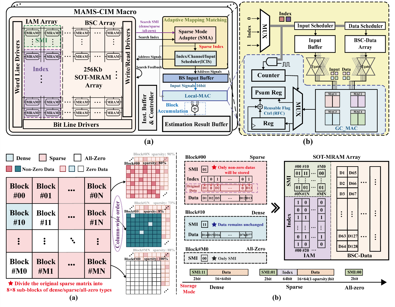 大规模MIMO下行预编码涉及高维稀疏矩阵运算,对存储与计算架构带来挑战。本文提出MAMS-CIM,一种基于256Kb SOT-MRAM的自适应压缩CIM加速器。其创新点包括:多稀疏模式块压缩策略实现dense/sparse/全零子块全覆盖;自适应映射匹配机制解决压缩存储后的对齐与功耗问题;基于高斯算法的复数乘法单元与复用控制器提升精度与效率。实验证明,在32×256×8 MIMO任务中,该方案在信噪比20dB时可将SER降至0.1%,并实现1.35×–8.35×存储压缩、最高39.4×能耗节省和9.85×加速,能效与吞吐率均优于现有方案。