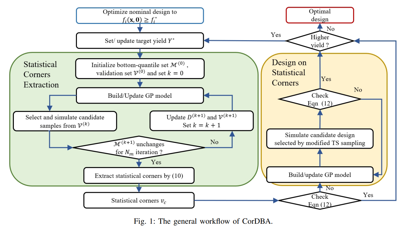 有限的资源和⾼昂的模拟成本之间的⽭盾,是先进节点电路设计中良率优化的核⼼挑战。本⽂提出了⼀种名为 CorDBA 的新框架,通过引⼊⼀种新颖的⻆提取⽅法,利⽤⼯艺随机性 的统计⻆信息,将良率优化过程与⾼成本的良率估计过程解耦。具体⽽⾔,参数优化过程在 ⼀组固定统计⻆下进⾏ max-minimum 优化,⽽电路是否满⾜良率要求则通过⽬标良率分位 数提取的统计⻆进⾏独⽴评估,这种解耦机制将原本乘法级的仿真复杂度降低⾄加法级。此外,CorDBA ⽀持多阶段渐进式优化,允许低良率阶段的优化信息被后续更⾼良率⽬标的优化过程复⽤。我们在模拟、数字及采⽤新型器件的多种电路上验证了该框架的有效性。实验结果表明,与当前最先进的⽅法相⽐,CorDBA 在 SPICE 模拟速度上实现了 3.6 倍的提升,并在稳健性⽅⾯(以标准差衡量)取得了⾼达 134.7 倍的显著改善。