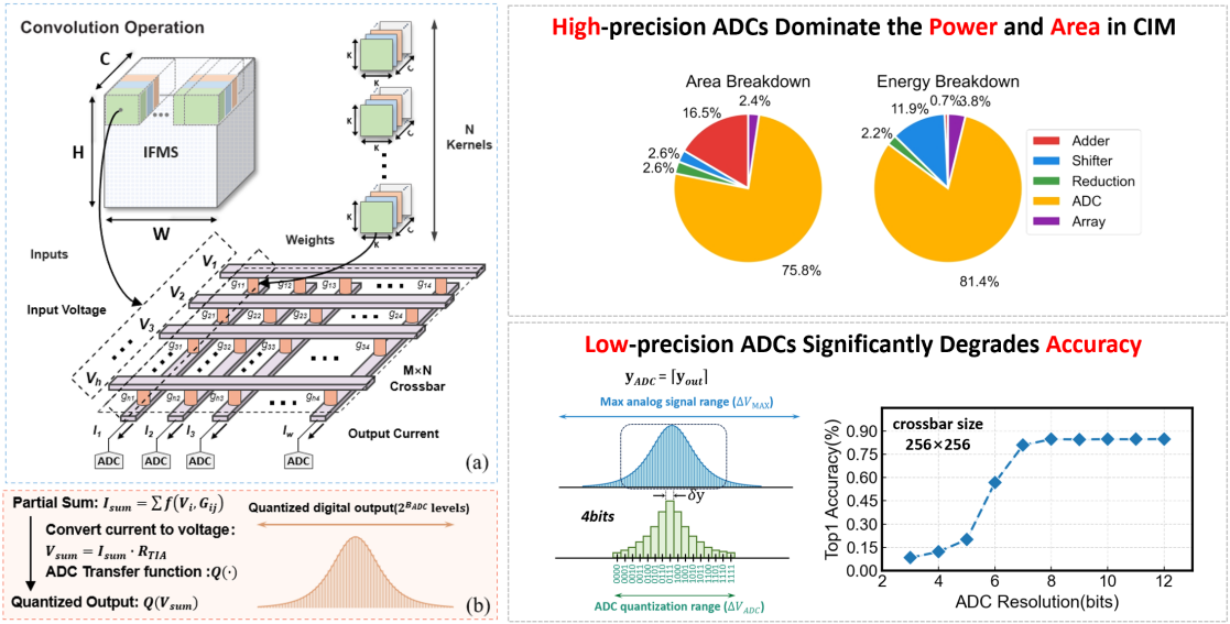 在人工智能推理加速领域,交叉阵列外围模数转换器(A/DC)的面积与功耗开销是存算一体(CIM)芯片的性能瓶颈。所提出的边界感知正则化量化(Boundary-Aware Regularized Quantization,BARQ)首次实现了不改动硬件、仅靠训练算法就将低位宽 A/DC 的成本优势转化为系统能效。BARQ 的核心创新在于把 A/DC 位宽边界形式化为对权重的 ℓ1 范数约束,在训练阶段主动抑制溢出截断并自然诱导非结构化稀疏,同时引入欧氏投影权重初始化,显著减少初始量化误差并加速模型收敛。实验数据显示,在 W/A=4/4 且仅 3 比特 ADC 的条件下,ImageNet/ResNet-50 精度仍达 75.54%(较全精度仅降低 0.59%),CIFAR-100/VGG-11 精度仅下降 1.33%;动态能耗降低 73%,硬件效能最高提升 3.79 倍。这一成果表明,BARQ 能够在保障推理准确率的同时显著提升 CIM 系统的能源效率与可部署性,为下一代低功耗、高性能的人工智能芯片提供了全新解决方案。