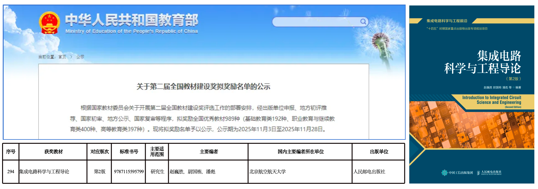 近日,教育部公布了第二届全国教材建设奖拟奖励名单。该奖项由国家教材委员会主办、教育部承办,每4年评选一次,是我国教材领域的最高奖项。我院赵巍胜、尉国栋、潘彪主编,聂天晓、王新河、林晓阳、贾小涛、温良恭、王昭昊等20余位师生共同编著,人民邮电出版社出版的《集成电路科学与工程导论 第2版》荣获全国优秀教材(高等教育类)二等奖,是集成电路领域唯一获奖教材。