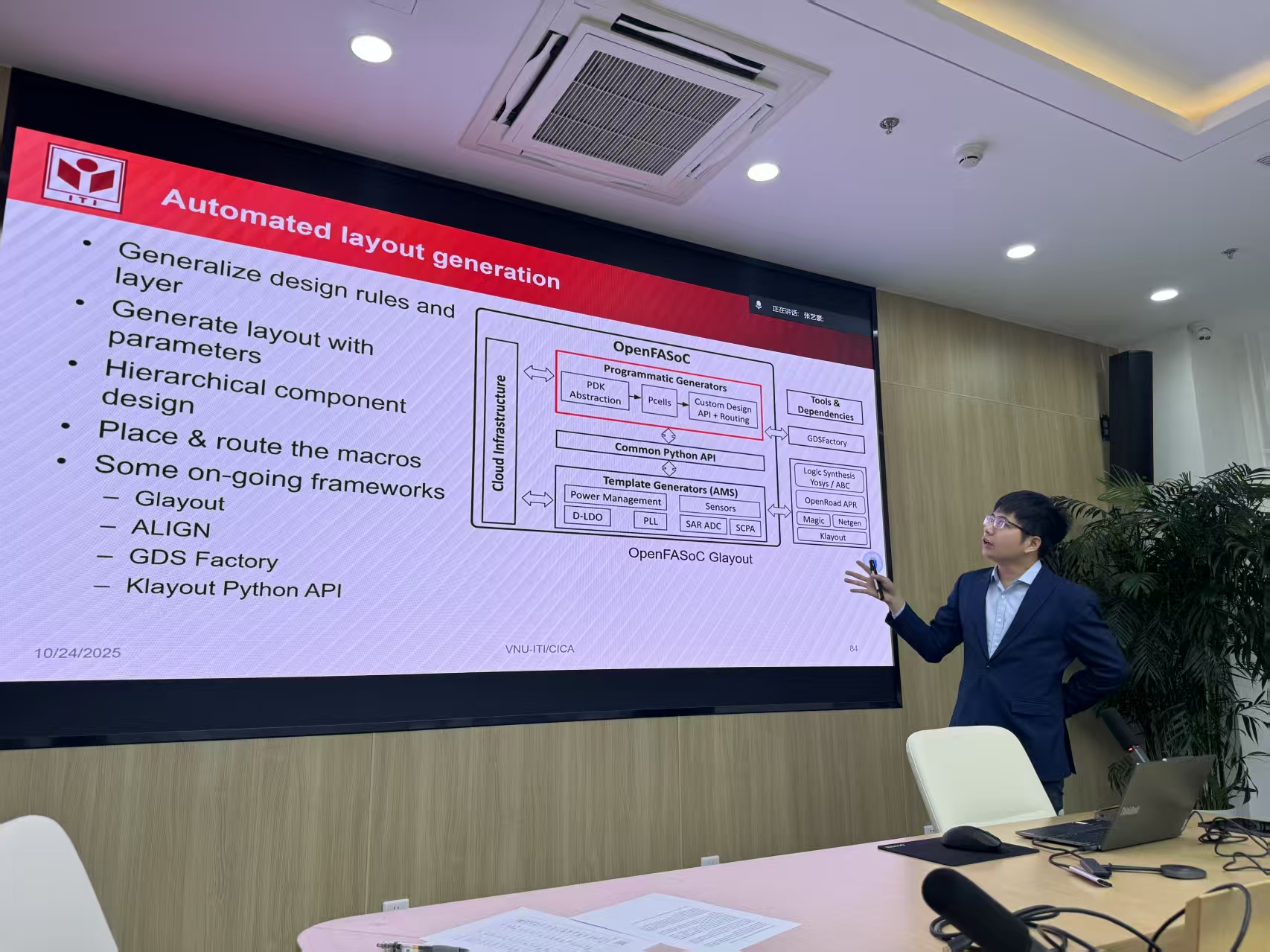 越南国立大学Duy-Hieu Bui助理教授完整演示了基于开源EDA工具与IHP SG13G2工艺设计套件的芯片设计全流程。内容覆盖传统模拟/混合信号设计方法,以及使用OpenROAD实现从RTL到GDSII的自动数字设计流程。他特别引入了“Code-a-Chip”这一创新概念,通过可交互、可重复执行的设计笔记本来封装设计流程,显著提升了芯片设计的透明度与复现性,为快速、开放的芯片创新奠定了方法学基础。