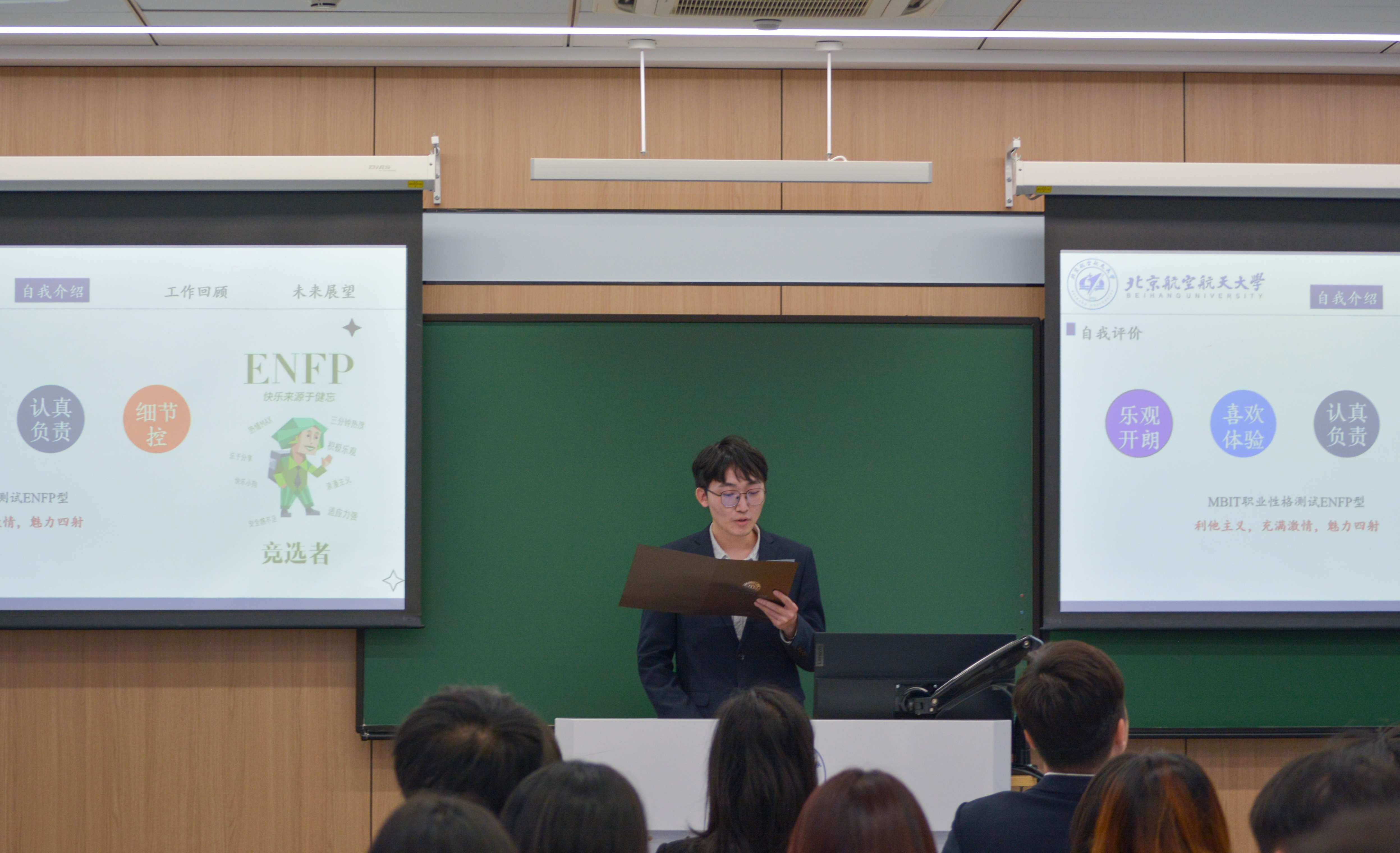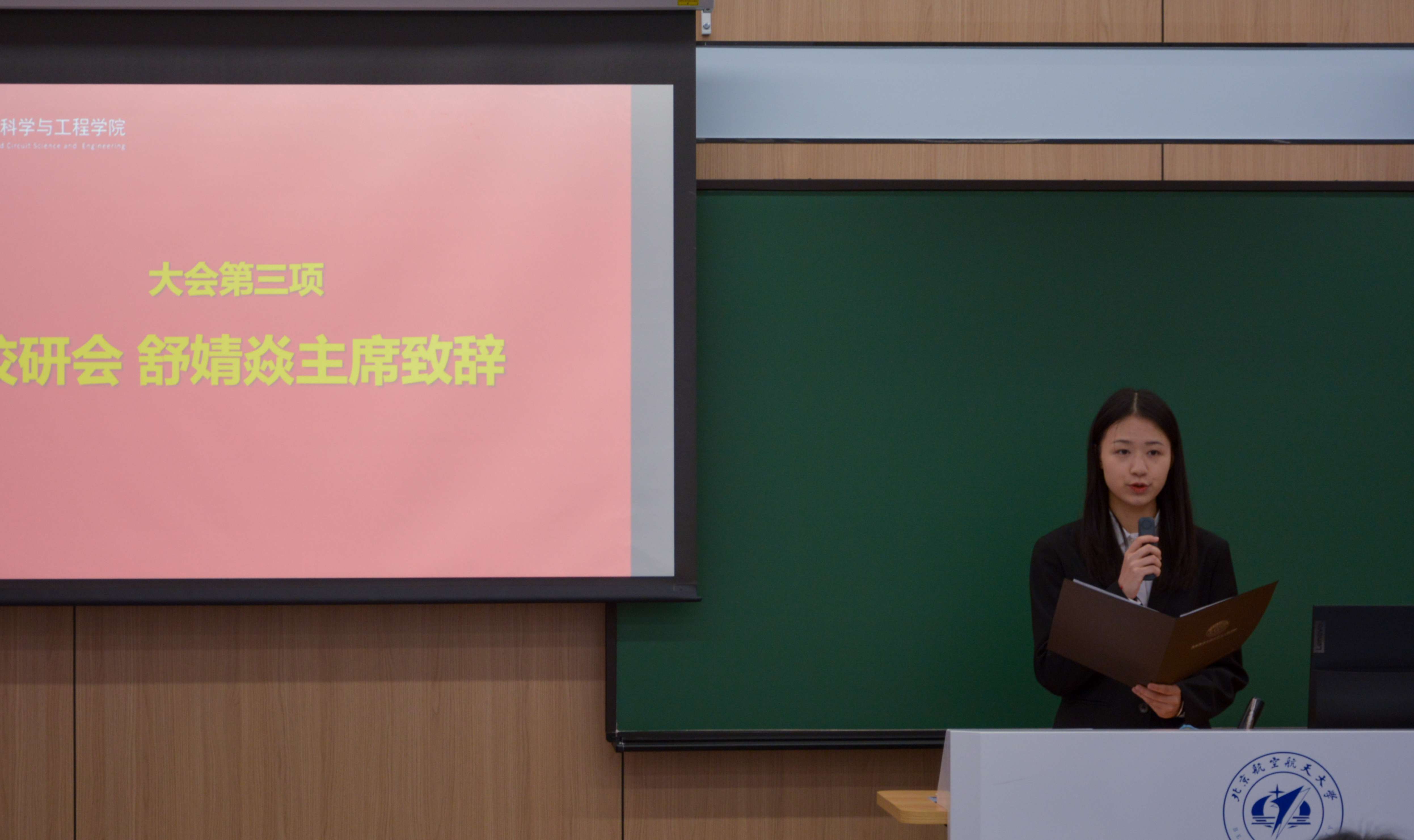 2025年10月19日下午2:00,北京航空航天大学集成电路科学与工程学院第五次研究生代表大会在学院路校区主203举行。校研究生会主席团成员舒婧焱,集成电路学院专职辅导员丁瑞云,专职辅导员胡晏铭,2025级研究生辅导员彭尹萱及全体57名研究生代表参会。本次大会由2024级研究生辅导员王知行主持。大会在庄严的国歌声中拉开帷幕。