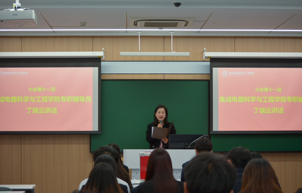 学院专职辅导员丁瑞云发表总结讲话,对上一届研会的辛勤付出表示感谢,并对新一届主席团提出三点期望,一是以忠诚铸魂,锚定“芯”方向;二是以榜样聚力,引领“芯”成长;三是以奉献作答,服务“芯”群体。勉励大家在学术探索中突破创新,在人生道路上砥砺前行,为学院高质量发展注入青春动能,为我国集成电路事业书写属于北航人的精彩答卷!