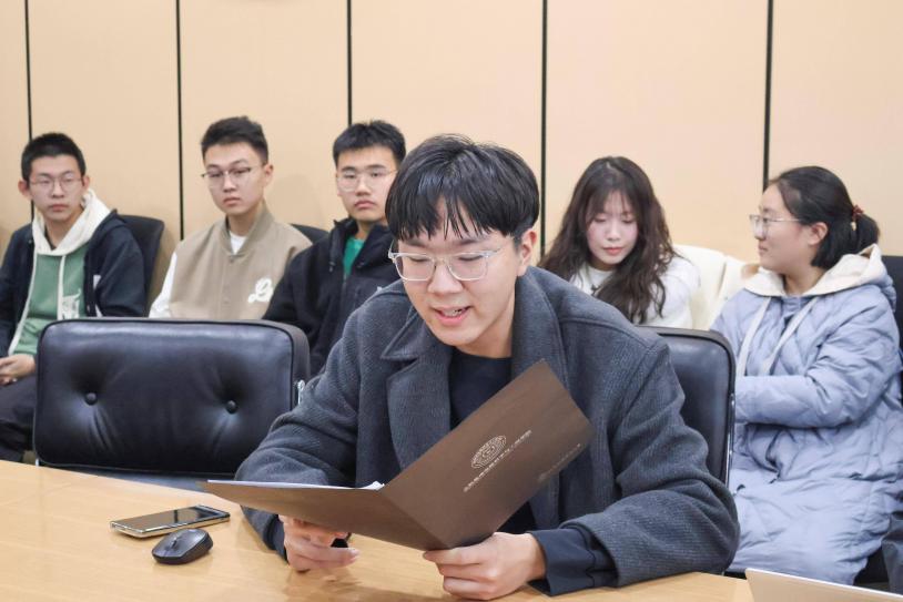 最后,邓修齐、郝黎宇依次进行了自我介绍,并表达了对学生会新成员的欢迎和对工作的展望:一是明确学生会服务同学的宗旨,无论是活动筹办还是日常工作,都应紧紧围绕同学们成长成才的实际需求,全心全意服务同学。二是发挥好桥梁纽带作用,学生会工作人员覆盖学院各本科生班级,可及时向学院反馈班级同学需求,共商举措解决对应问题;三是重视自身全面发展,学生会工作人员应扎实完成课业学习、保持优良成绩,同时在学生会工作中重点提升公文写作、沟通交往、活动筹办等综合能力,获得切实锻炼和成长。