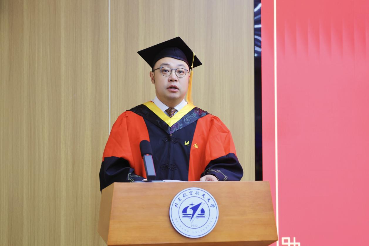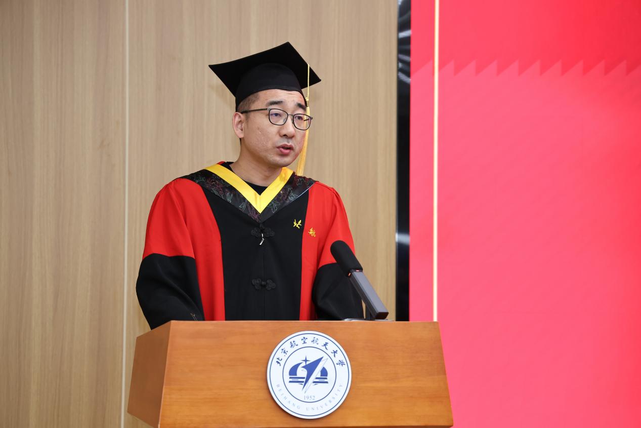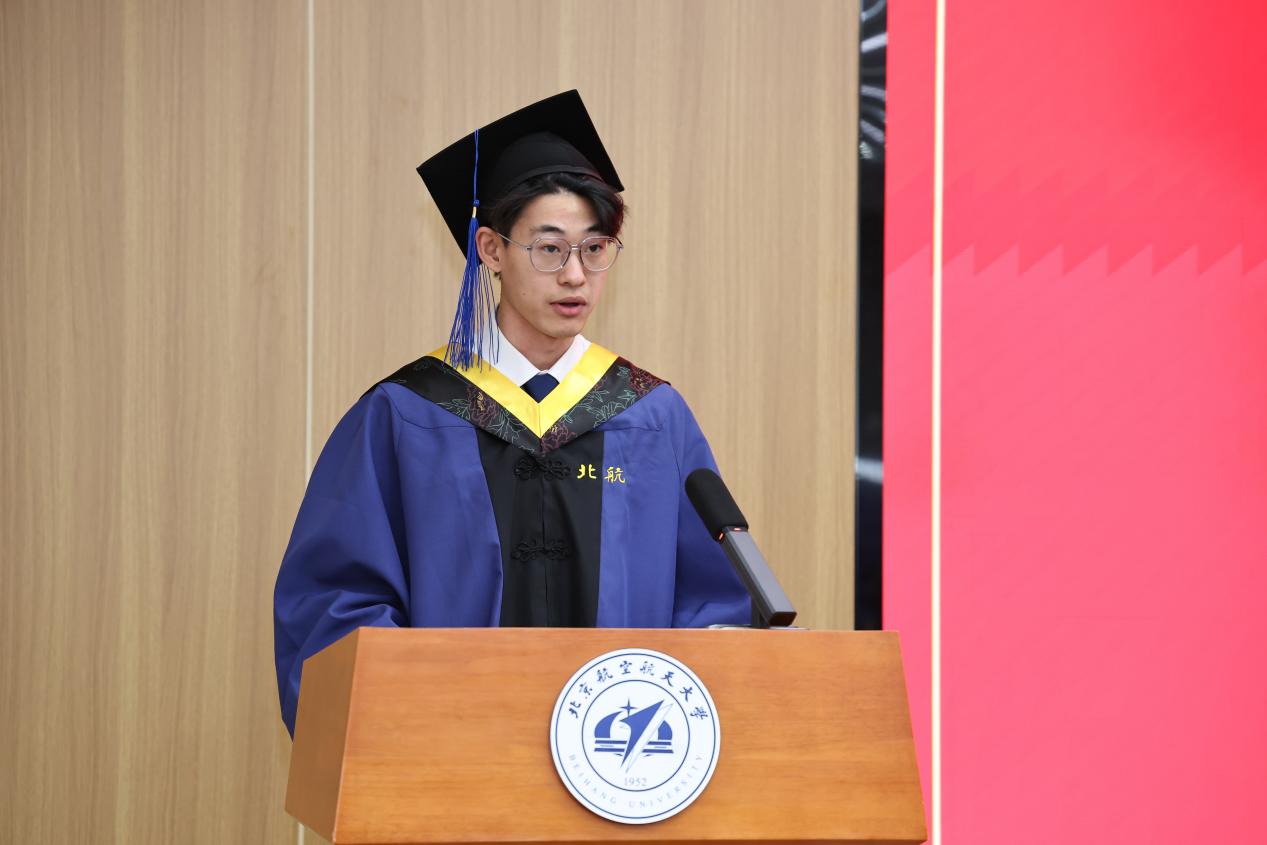 毕业生代表、2023级硕士研究生刘继隆代表全体毕业生向母校、老师、家人表达了感恩之情。他回顾自己在学院求学的本硕七年时光,不仅是学院发展的见证者,更是这份辉煌征程的亲历者、参与者,与学院携手同行、双向成长。这段经历,让他从迷茫忐忑成长为独立敢为的青年,更沉淀下“矢志不渝,敢为人先,致真唯实,芯片报国”的北航“芯”精神,成为未来前行的宝贵财富。