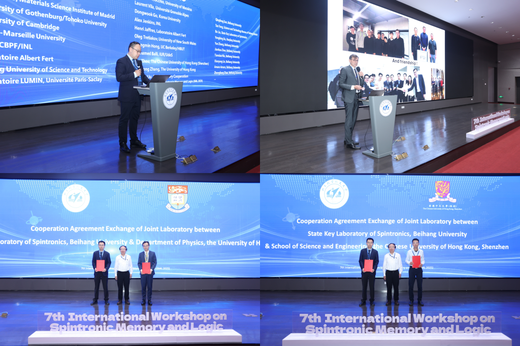 接下来,张悦教授回顾了北航与国际各地的长期合作,着重介绍了杭州北航国际创新研究院(学院)的定位和发展,并对未来更广泛的国际合作与交流表达了美好希冀。Stephane Mangin教授热烈欢迎了到场的各位国内外参会人员,表达了对北航联合培养研究生的高度认可,并对本次大会的组织者表示了衷心感谢。林晓阳教授介绍了自旋芯片与技术全国重点实验室的建设情况和未来规划,并与香港大学物理学院、香港中文大学(深圳)理工学院签订了联合实验室合作协议。
