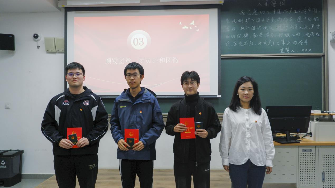 名单宣读环节,主持人正式宣读了本期新发展团员名单,丁瑞云代表学院分团委为新团员逐一颁授团章、团员证和团徽。闪亮的团徽佩戴于胸前,标志着荣誉,更承载着沉甸甸的责任。