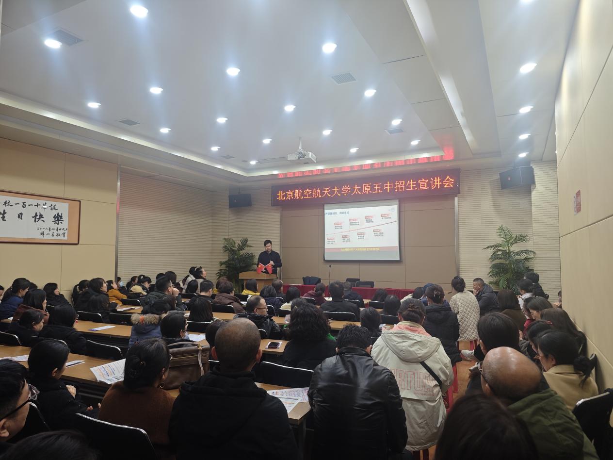 11月20日晚上,招生组走进太原市第五中学,韩国军老师以《趣说 “飞机的颜值 骨骼和心脏”》为题,为高一火箭班200余名学生带来生动鲜活的科普讲座,深入浅出解读航空航天知识;山西招生组成员胡晏铭面向高三年级学生家长开展招生政策宣讲,并与现场学生、家长进行互动交流,细致解答报考疑问,得到师生及家长的热烈响应与高度认可。