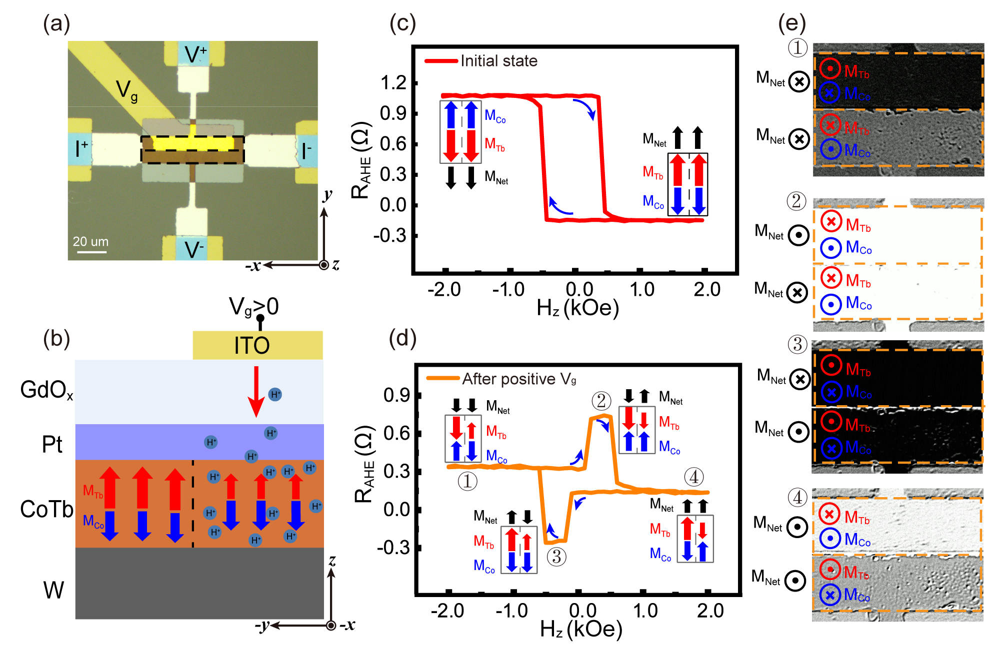 针对这一关键问题,团队围绕另一类磁性材料——亚铁磁合金材料展开研究。亚铁磁合金CoTb具有双亚晶格反铁磁耦合、杂散场低、磁结构丰富等特点。研究结果表明,利用固态氢离子栅控结构,通过电压驱动氢离子在亚铁磁薄膜中的非对称迁移,能够构建出一种非常规的新型磁型结构。具体而言,该磁性结构表现为相邻区域净磁化方向相反,但亚晶格磁矩方向相同,即具有“宏观上表现出不同磁畴,但微观上磁畴转化区域并不存在畴壁”的特点(见图1),突破了传统磁畴与畴壁相伴产生的常规认知。并且,通过电压控制氢离子迁移方向,能够动态、可逆地调控该新型磁性结构的存在与湮灭。
