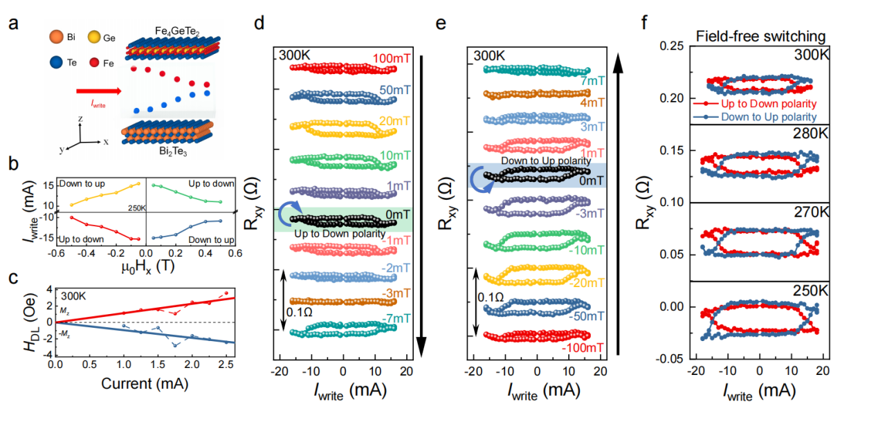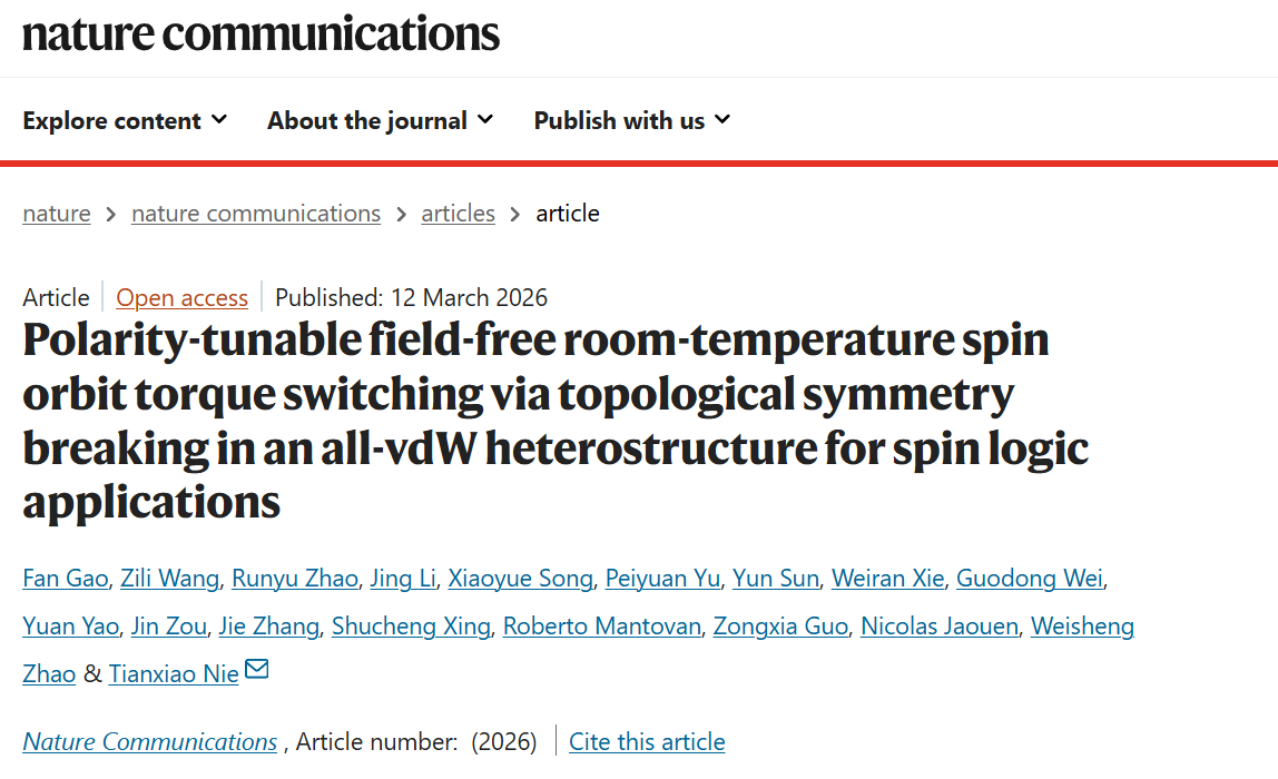 近日,北航集成电路科学与工程学院赵巍胜教授、聂天晓教授团队在二维自旋电子学领域取得重要进展,相关研究成果以“Polarity-tunable field-free room-temperature spin orbit torque switching via topological symmetry breaking in an all-vdW heterostructure for spin logic applications”为题发表于《自然·通讯》(Nature Communications)期刊。研究团队成功制备了全范德华异质结Bi2Te3/Fe4GeTe2,首次在室温下实现了极性可调、无需外加磁场辅助的自旋轨道矩驱动磁化翻转,并在单器件中实现了16种可重构布尔逻辑功能,为低功耗、高集成的二维自旋电子器件开辟了新路径。