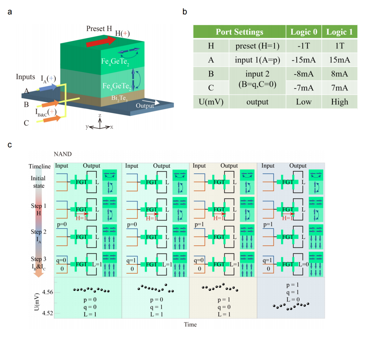 为了解决这一难题,研究团队利用分子束外延技术,成功制备出高质量的晶圆级Bi2Te3/Fe4GeTe2全范德华异质结。该异质结充分发挥了二维材料原子级平整界面的优势,实现了优异的自旋输运效率。研究发现,拓扑绝缘体Bi2Te3与二维铁磁材料Fe4GeTe2之间的界面耦合作用,诱导了Fe4GeTe2层中垂直磁各向异性的产生,而Fe4GeTe2自身剩余的面内磁各向异性分量则打破了反演对称性,从而实现了无需外加磁场辅助的确定性磁化翻转。更为重要的是,通过调控面内磁各向异性分量的方向,可在低至约1.55×106 A/cm2的电流密度下,实现对磁化翻转极性的灵活控制。基于该器件的优异电学特性,研究团队进一步展示了在单个器件中实现16种可重构布尔逻辑功能的能力,为构建全电控、可重构的自旋逻辑单元提供了可行方案。